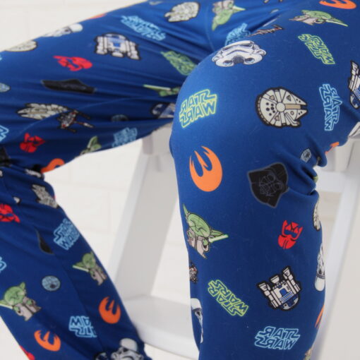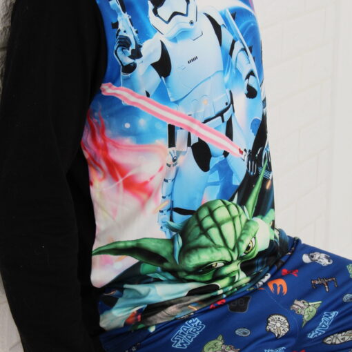 Эта пижама сочетает в себе изысканный дизайн и комфорт. Черный и синий цвета, дополненные элементами из мира Звёздных войн, создают впечатляющий образ для настоящего фаната. Качественные материалы — 95% хлопок и 5% эластан — гарантируют мягкость, долговечность и поддержание формы.