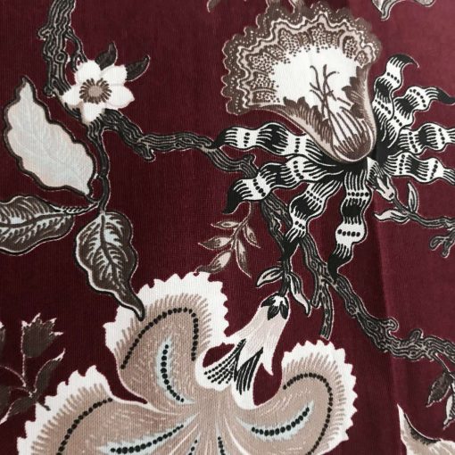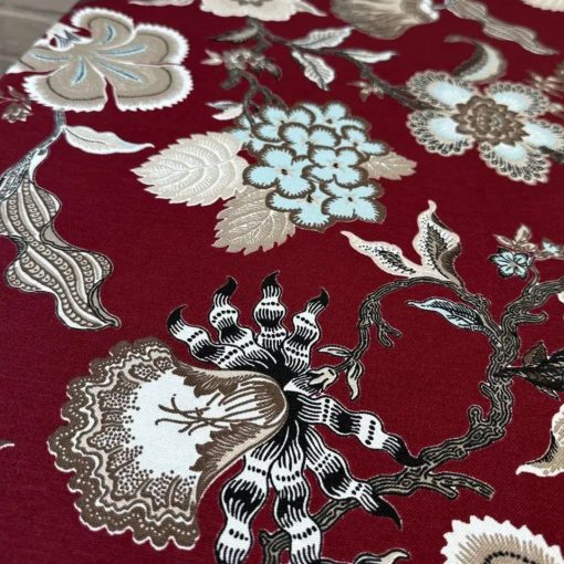 Ткань ДАК с утонченным цветочным орнаментом на глубоком бордовом фоне — это сочетание классической изысканности и глубокого цвета, который привлекает внимание. Такой дизайн прекрасно смотрится в интерьерах с акцентом на роскошь, стиль и уют. Идеально подходит для скатертей, штор, чехлов, декоративных аксессуаров и кухонного текстиля.